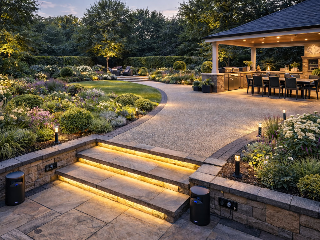 The right lighting changes how you use the garden. Add discreet power and audio and the space becomes genuinely functional.